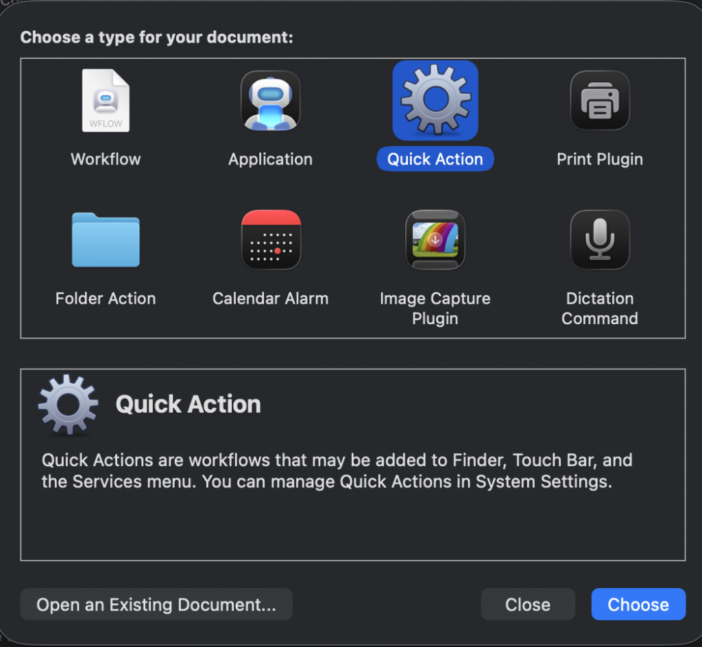 Önce Automator i acip “Quick action” seciyoruz yada new diyip seciyoruz.